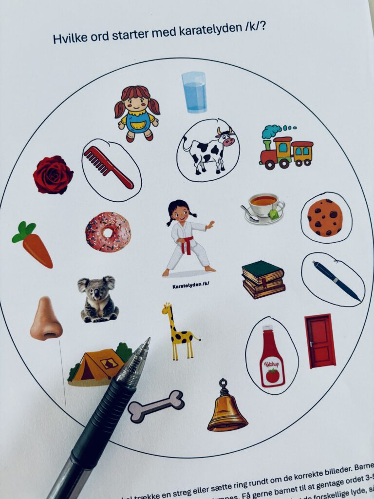 Barnet skal trække en streg eller sætte ring rundt om de ord som starter med den konkrete lyd. Barnet skal samtidig benævne de konkrete ord, så udtalen trænes. Få gerne barnet til at gentage ordet 3-5 gange.