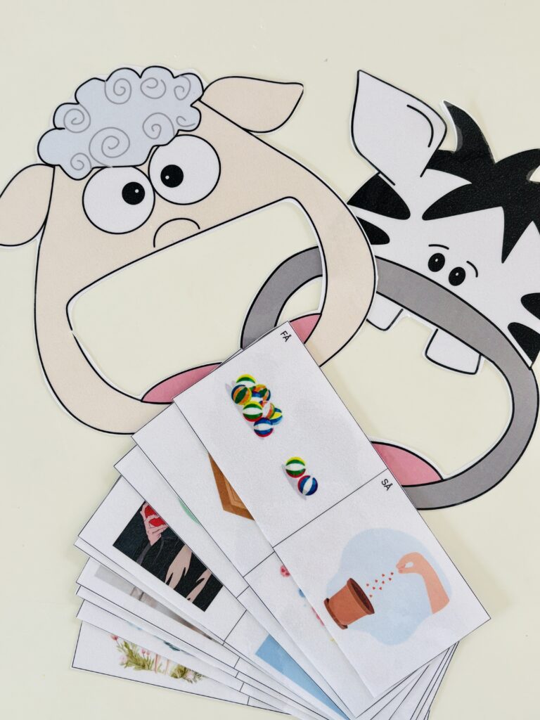 Der er mange måder at arbejde med minimale par på. I dette spil vil dyrene kun spise deres egen lyd – barnet skal lydskelne og fodre dyrene med de rigtige ord.