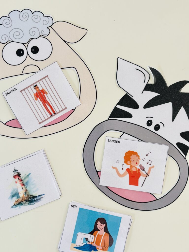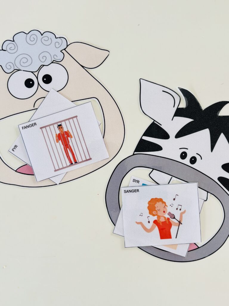 - Barnet får herefter lov til at placere kortet i et af dyrenes munde. Hvis barnet placere billedet korrekt så sig fx, “det var flot, fis starter nemlig med fårets lyd”. Hvis barnet placerer billedet forkert, så sig fx, “hov, det her er hvalens lyd – vvvvv. Starter fffffis med fffffårlyd eller hvvvvvvallyd?” Gennemgå alle kortene på denne måde.