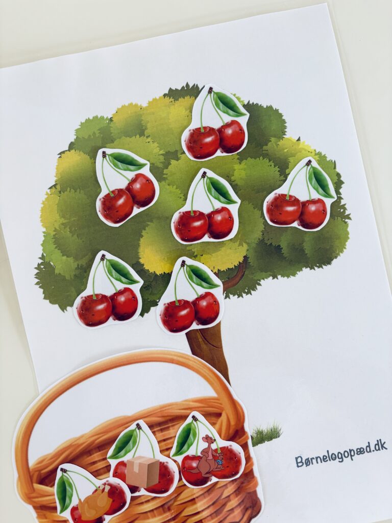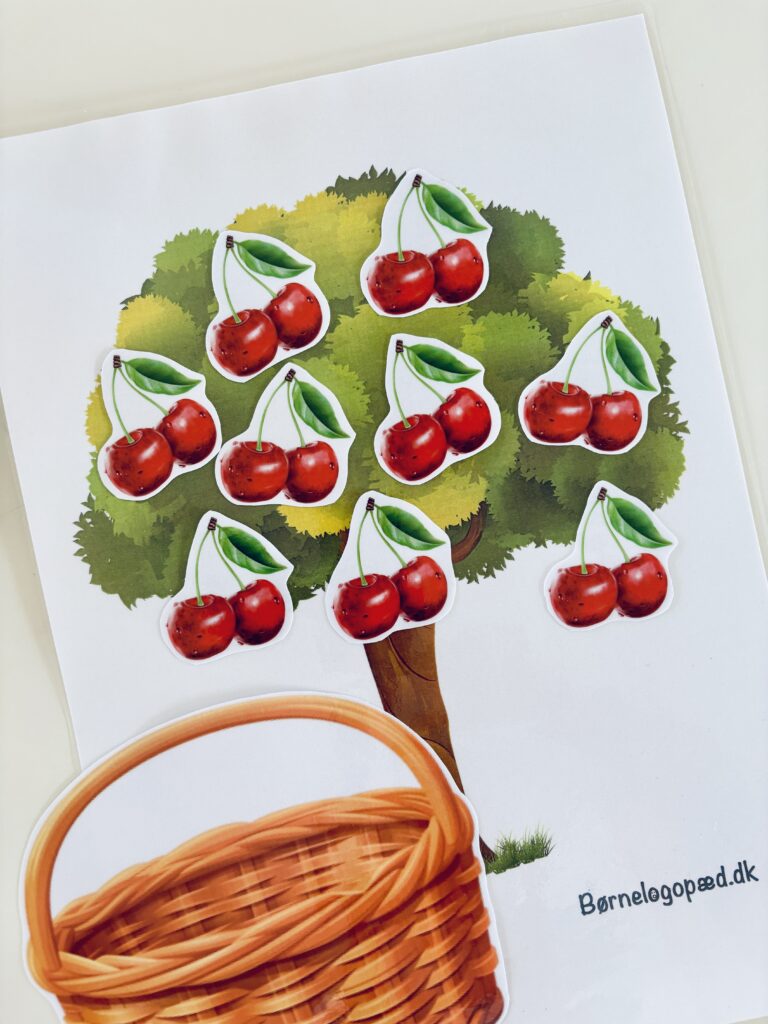 Inden spillet starter, så snak med barnet om den lyd I skal arbejde med – hvordan lyden produceres og lyder, og om barnet kan huske nogle ord der starter med lyden. Herefter kan spillet starte. Barnet skal ”plukke” én frugt fra træet, benævne billedet (gentag gerne ordet 3-5 gange så udtalen trænes ekstra) og herefter placere frugten i kurven. Fortsæt indtil alle frugterne er plukket.