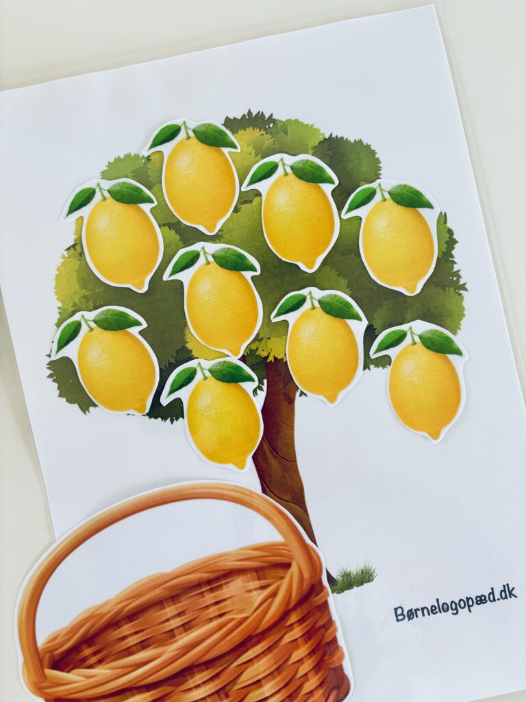 Inden spillet starter, så snak med barnet om den lyd I skal arbejde med – hvordan lyden produceres og lyder, og om barnet kan huske nogle ord der starter med lyden. Herefter kan spillet starte. Barnet skal ”plukke” én citron fra træet, benævne billedet (gentag gerne ordet 3-5 gange så udtalen trænes ekstra) og herefter placere citronen i kurven. Fortsæt indtil alle citronerne er plukket.