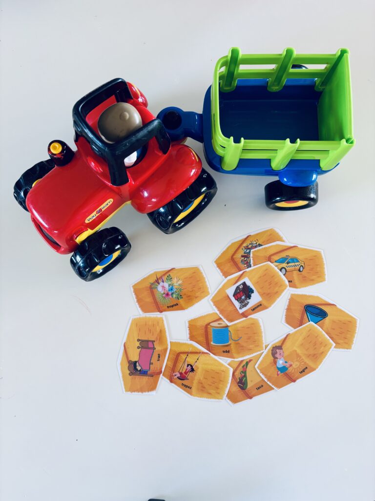 Udvælg de målord du vil arbejde med. Sørg for at printe materialet på begge sider af papiret, så halmballerne automatisk ses på begge sider. Herefter lamineres materialet. Jeg anbefaler at laminere materialet, da brikkerne ellers vil være svære at ”trække” op. Klip alle halmballerne ud og placer dem med bagsiden opad foran barnet. Fortæl barnet, at vi i dag skal øve os på toglyden (t-lyden). Barnets opgave er at ”løfte tunge halmballer med traktoren” (også en god sætning at øve med barnet!).