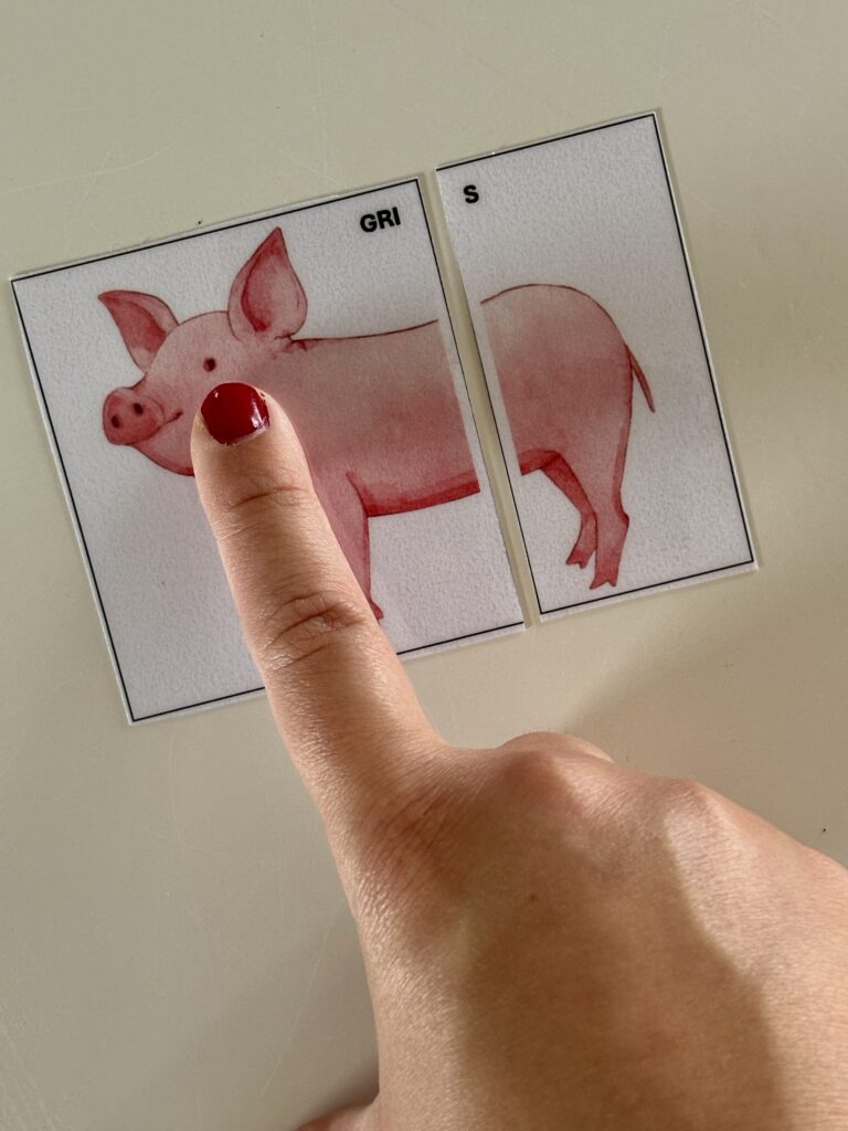 Dette spil minder lidt om et sjovt puslespil, som træner barnets finale lyde, på en ny og anderledes måde. Ved at dele lyden op, er det nemmere for barnet at sige den finale lyd, og dette er derfor god træning for barnet med fonologiske vanskeligheder.