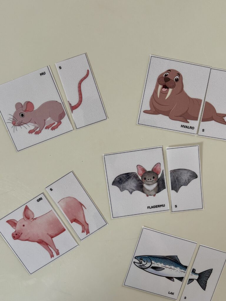 Barnet skal nu trække et billede ad gangen. Når barnet trækker et billede, skal barnet finde den matchende ”hale”. Barnet skal placere halen på billedet og samtidig benævne ordet, så udtalen trænes (gentag gerne ordet 3-5 gange, så udtalen trænes ekstra).