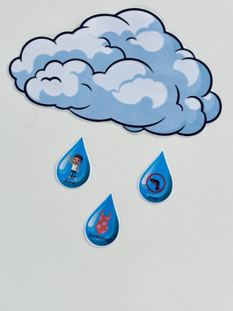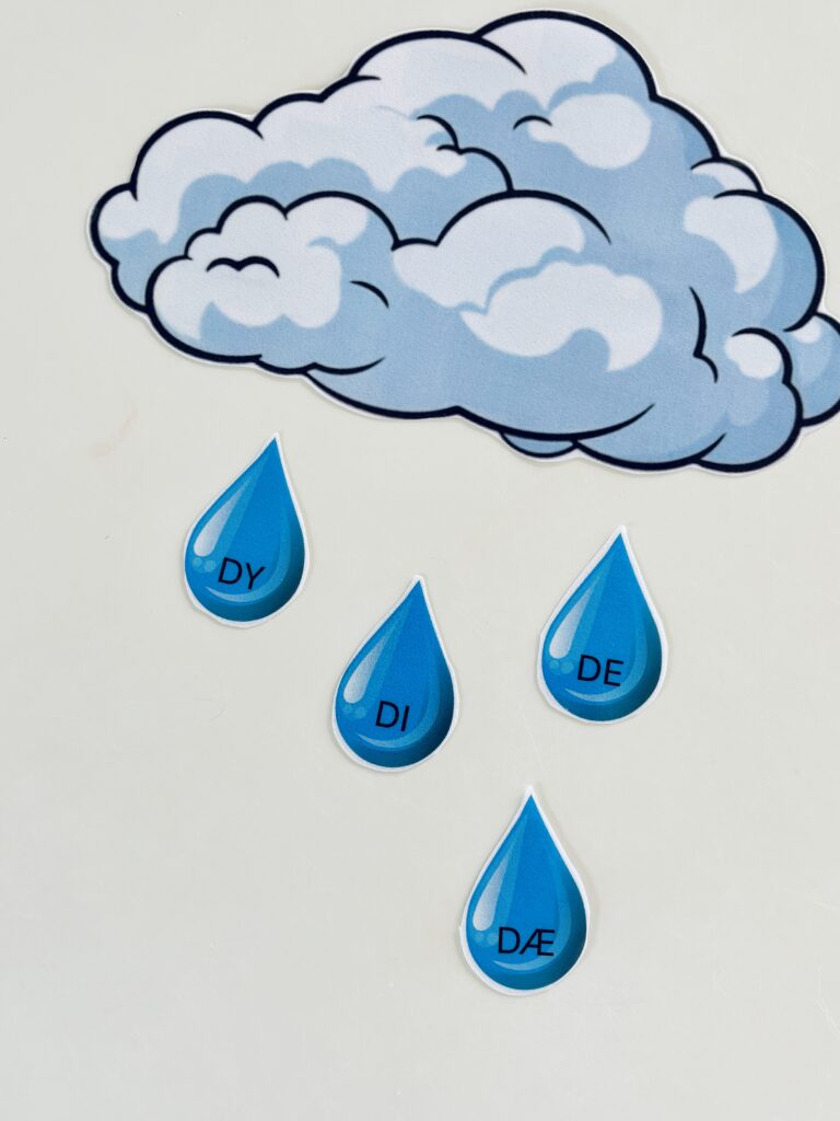 Udvælg de målord du vil arbejde med, print materialet ud og laminer gerne, så regndråberne er nemmere at samle op. Placer skyen foran barnet og snak med barnet om den lyd I skal øve jer på – rævelyden/regnlyden. Snak om lyden, hvordan lyden produceres og lyder. Regndråberne placeres med bagsiden opad. Barnet skal trække én regndråbe ad gangen, benævne ordet (gentag gerne 3-5 gange) og placere regndråben under skyen. Til sidst vil skyen være fyldt med regn.