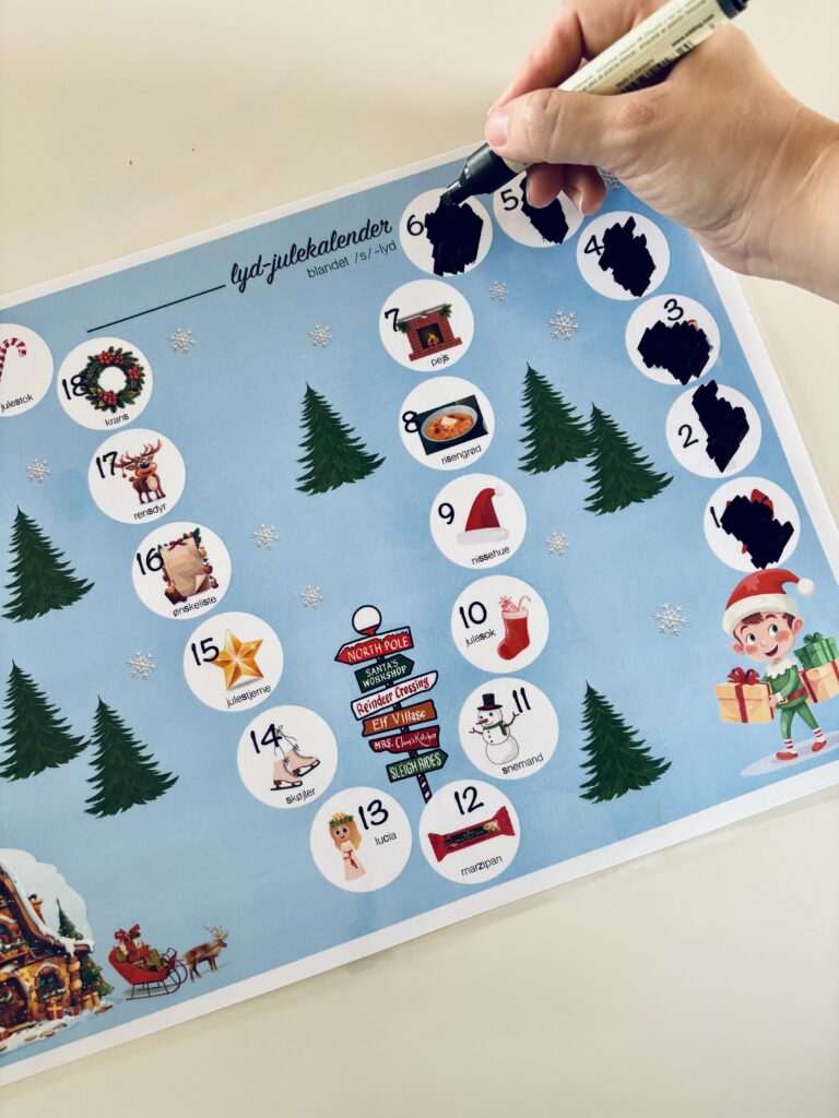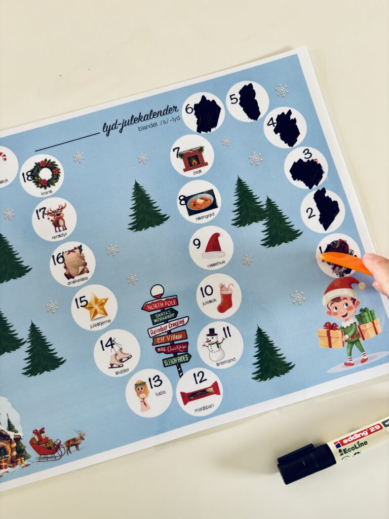 Print julekalenderen ud i A3-format, så billederne tydeligt kan ses. Laminer kalenderen og farvelæg “lågerne” med tusch, så de daglige øveord skjules. Hver dag i december kan barnet skrabe én ny låge – tuschen kan skrabes af med en mønt eller andet. Øv øveordet flere gange i løbet af dagen. Øv også gerne ordet i sætninger, hvis barnet er klar til dette. Aftal med barnet hvor mange gange barnet skal øve ordet.