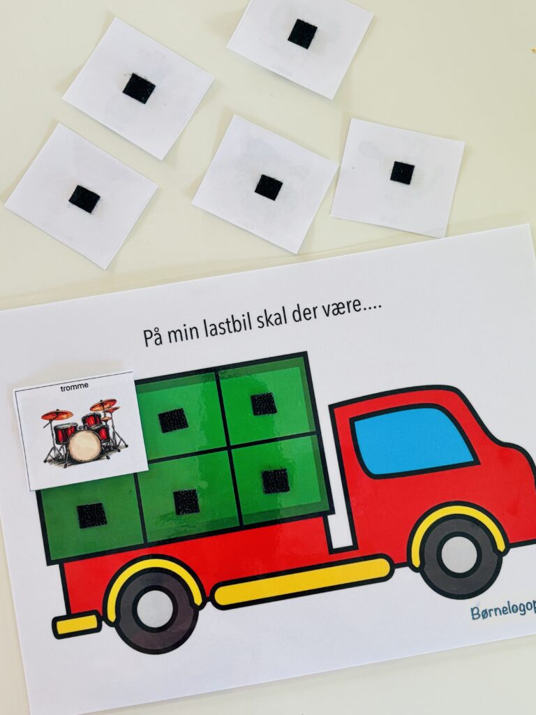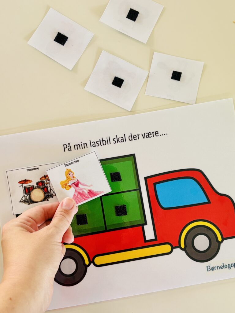 Barnet skal trække ét billede ad gangen og placere det på lastbilen. Barnet skal herefter sige sætningen “På min lastbil skal der være en tromme“. Barnet skal derefter trække et nyt billede og placere det på lastbilen. Barnet skal herefter sige sætningen “På min lastbil skal der være en tromme og tornerose“. Barnet trækker endnu et billede og siger sætningen “På min lastbil skal der være en tromme, tornerose og en trold“. Sådan fortsætter man med alle seks billeder. På denne måde får barnet produceret øveordene mange gange og samtidigt trænet øveordene i en sætning, hvilket hjælper på automatiseringen til spontantalen.