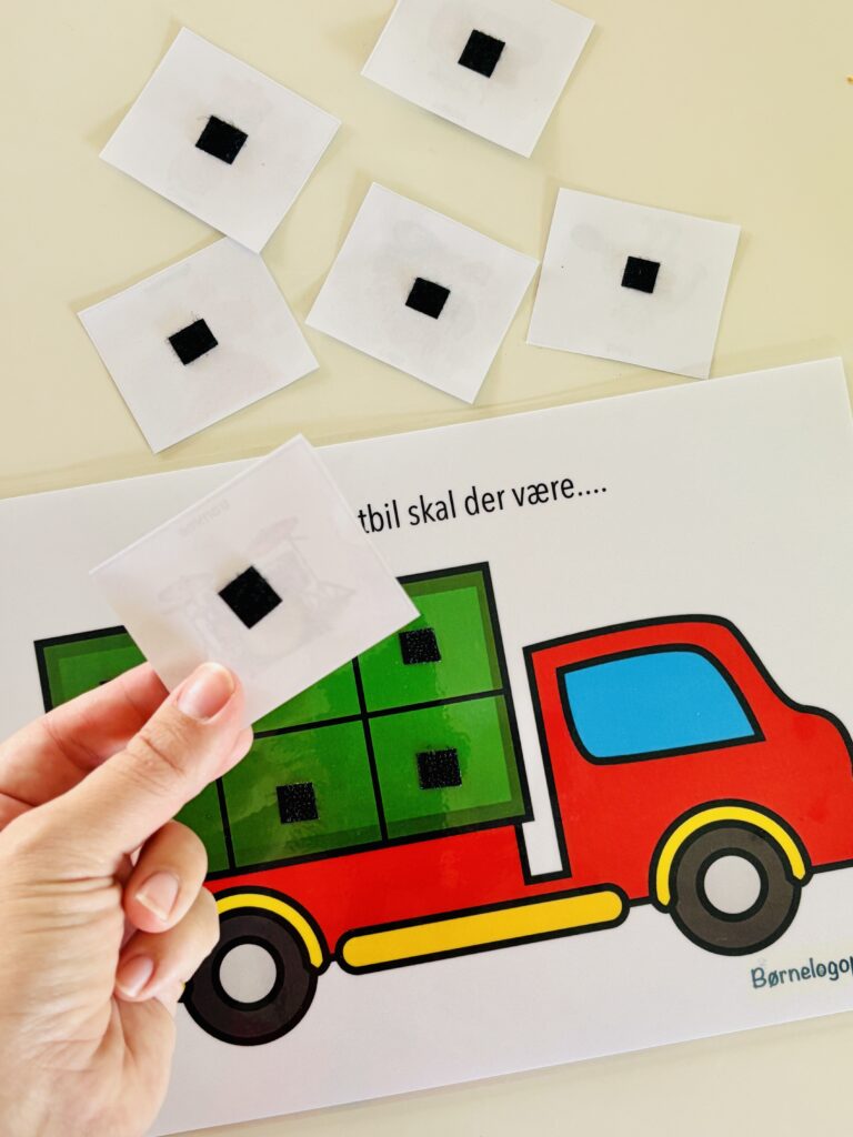 Klip billederne ud og placer velcro på brikkerne samt på lastbilen. Spillet kan også spilles uden, hvis man ikke har velcro.