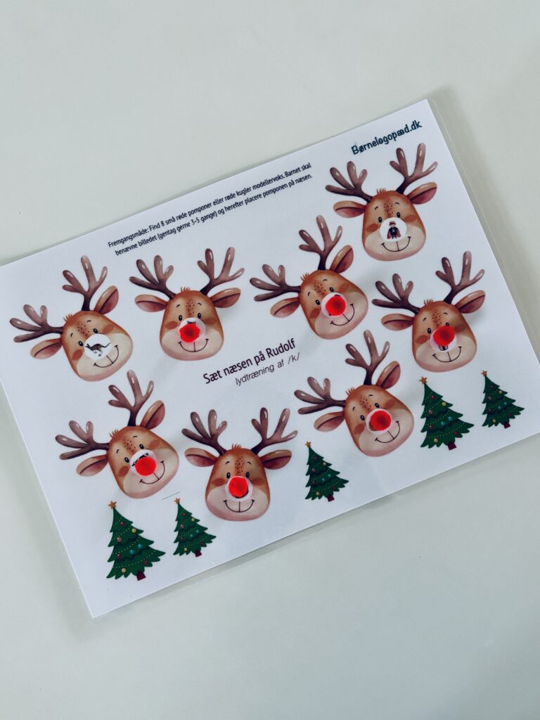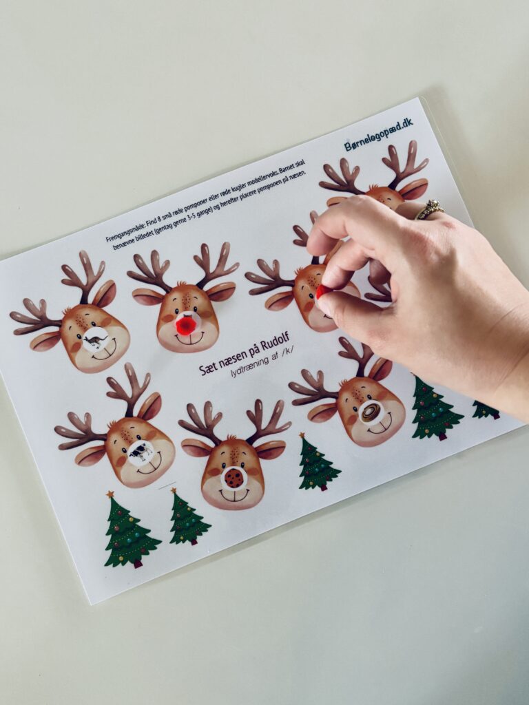 Dette spil er et hyggeligt lille julespil til udtaletræning. Udvælg den lyd du vil arbejde med og print spillepladen ud. Snak først om de forskellige ord på spillepladen og øv udtalen af ordene. Derefter får barnet 8 små røde pomponer (alternativt små kugler modellervoks). Barnet skal placere én pompon ad gangen på rensdyrets næse, så rensdyret trylles om til Rudolf. Herefter skal billedet benævnes, så udtalen trænes. Gentag gerne ordet 3-5 gange. Fortsæt indtil alle pomponerne er placeret og alle billederne er benævnt.