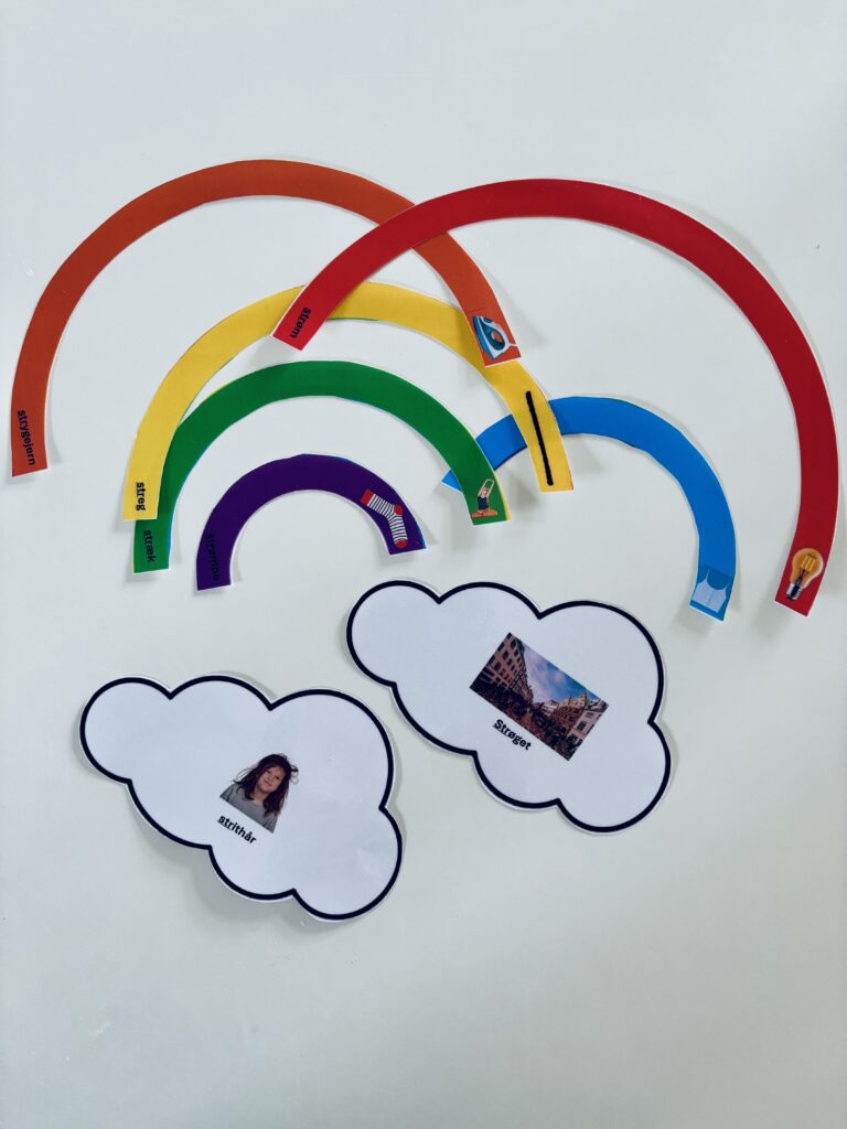 Udvælg den/de målord du vil arbejde med, og klip regnbuens striber ud. Det kan være en hjælp at placere striberne synligt for barnet. Barnet skal trække én stribe ad gangen, benævne ordet (gentag gerne 3-5 gange) og herefter placere striben så regnbuen gradvist bygges. Når regnbuen er færdig og skyerne placeret for enden af regnbuen, er spillet slut.