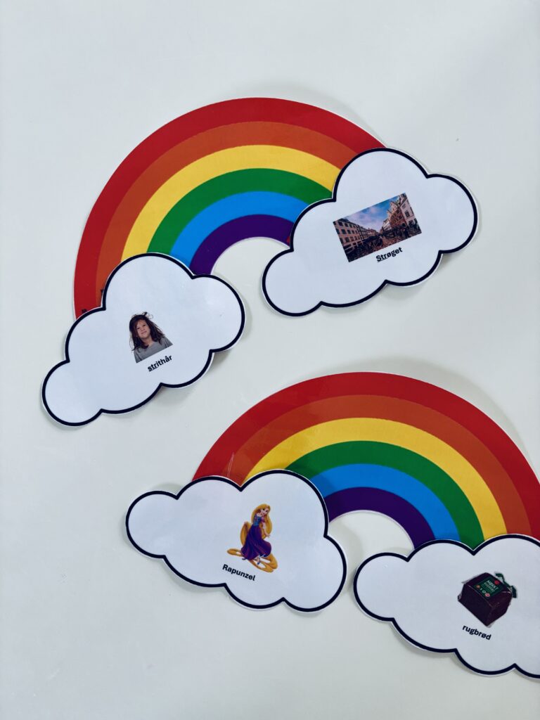 En regnbue består af striber – og det er lige netop denne konsonantklynge vi skal øve i dette spil. Udvælg den/de målord du vil arbejde med, og klip regnbuens striber ud. Det kan være en hjælp at placere striberne synligt for barnet. Barnet skal trække én stribe ad gangen, benævne ordet (gentag gerne 3-5 gange) og herefter placere striben så regnbuen gradvist bygges. Når regnbuen er færdig og skyerne placeret for enden af regnbuen, er spillet slut.