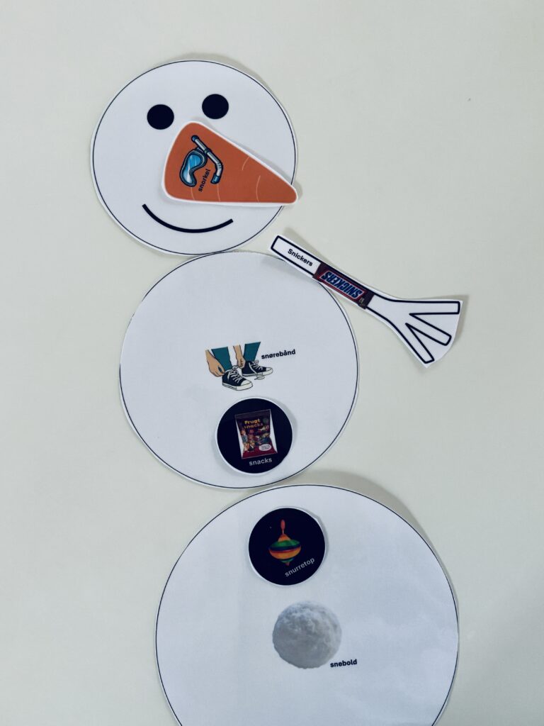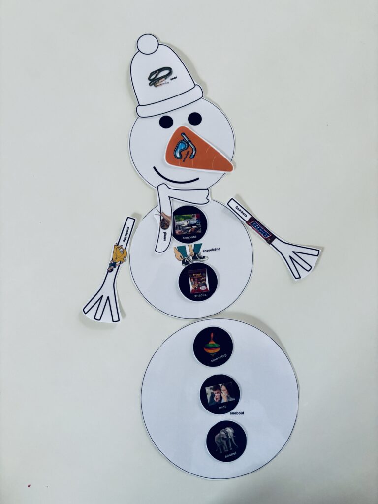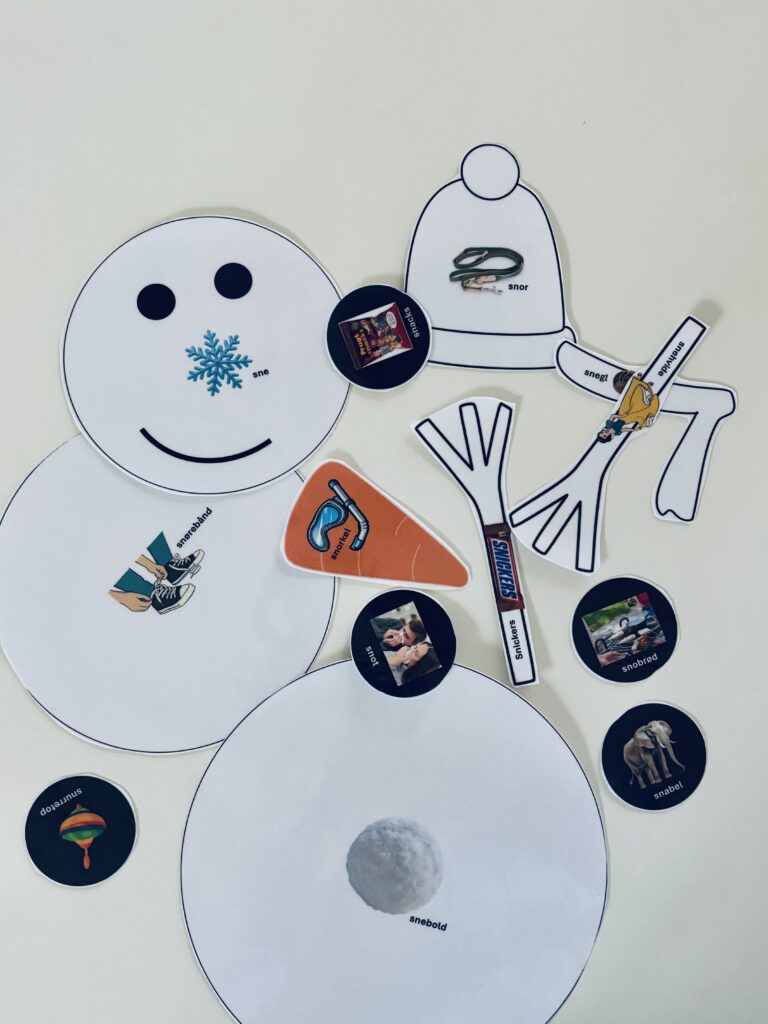 Udvælg de lydkombinationer du vil arbejde med. Print materialet ud og laminer gerne, så brikkerne er nemmere at håndtere. Det er op til dig, hvis du vil spille med synlige brikker eller placere dem med bagsiden opad. Barnet skal trække én brik ad gangen, benævne ordet (gentag gerne ordet 3-5 gange), og placere brikken. Gradvist bygges snemanden op. Fortsæt indtil alle billederne er placeret og snemanden er færdig.