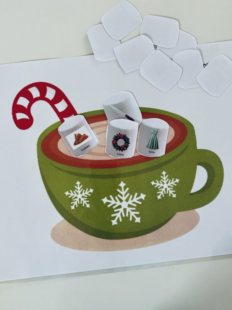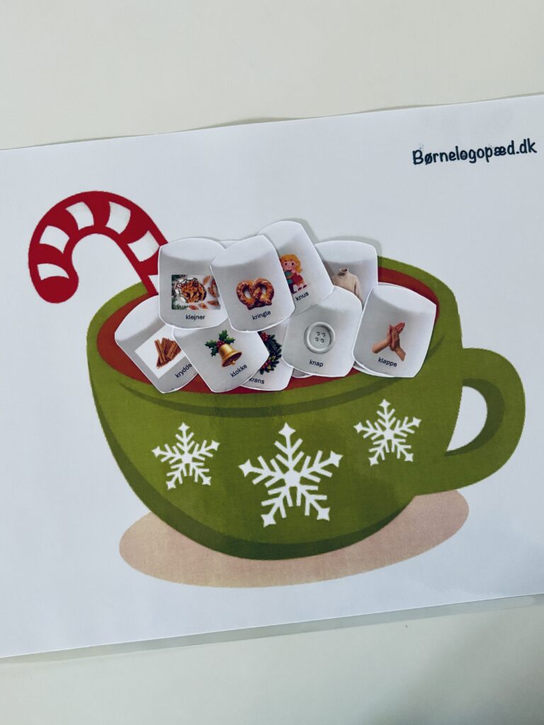 Print materialet ud og laminer gerne materialet, så skumfiduserne er nemmere at vende. Udvælg den/de lyde du vil arbejde med og klip skumfiduserne ud. Placer koppen med kakao foran barnet og placer skumfiduserne med bagsiden opad.