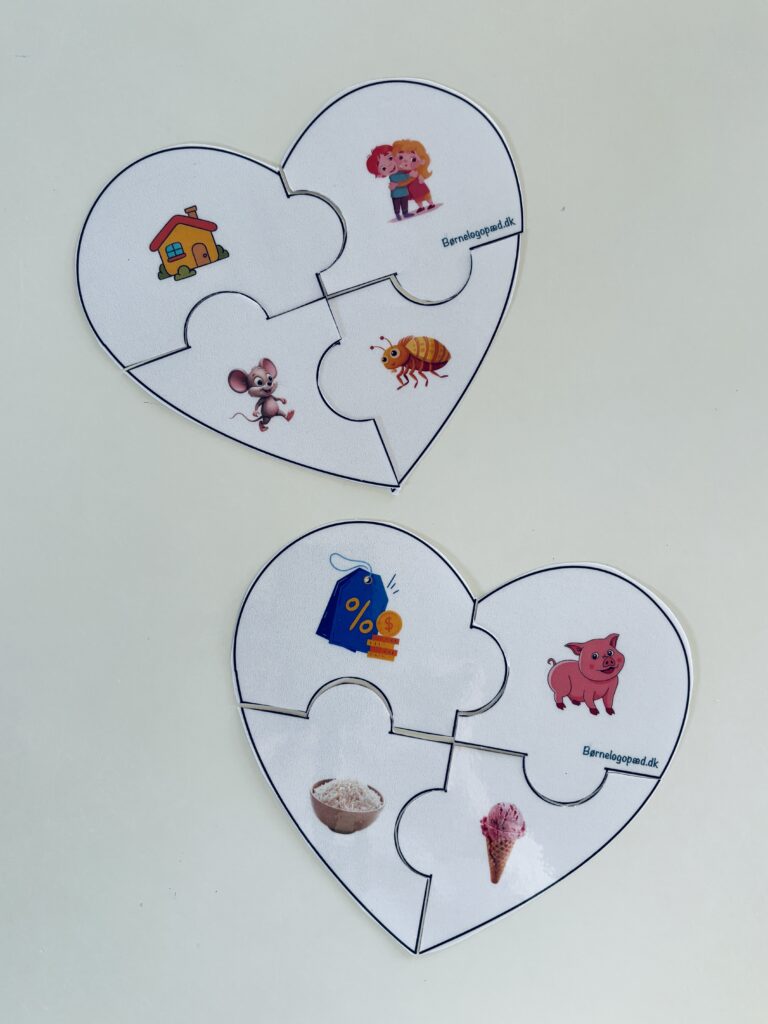 Print hjerterne ud, laminér så de er nemmere at arbejde med, og klip brikkerne ud. Placér alle brikkerne med bagsiden opad og lad barnet trække én brik ad gangen. Barnet skal benævne ordet og placere brikken på bordet. Den næste brik som barnet trækker skal igen benævnes, og barnet skal bedømme om den rimer på den forrige brik. Langsomt bygges hjerterne op. Fortsæt indtil alle hjerterne er bygget færdigt. Når alle hjerterne står klar, så benævn alle ordene igen. Øg evt. hastigheden lidt i benævnelsen, så ordene automatiseres.