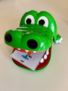 Krokodillehapseren er altid et stort hit, og altid den jeg tager frem hvis jeg lige har 5 min. tilbage af undervisningen. Barnet skal trække ét øveord ad gangen, benævne ordet og herefter smide kortet ind i krokodillens mund. Barnet må trykke på én tand. Fortsæt ligeledes indtil krokodillen hapser. Hvor mange ord kan barnet mon nå at benævne inden da?