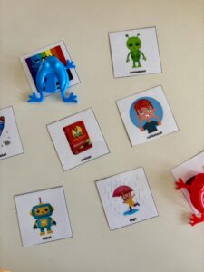 Placér alle øvekortene rundt omkring på bordet – gerne med lidt afstand, da frøerne kan springe meget langt. Det kort som frøen lander på (eller tæt på) skal barnet benævne (gentag gerne ordet 3 gange). Det er ret svært at få frøen til at springe i den rigtige retning, hvilket gør spillet ret sjovt. Lad gerne kortene ligge så bilederne kan gentages, hvis frøen lander der igen.