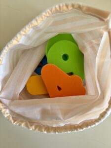 Hver gang barnet trækker et øveord, trækker man også ét tal fra posen. Tallet er det antal gange barnet skal gentage ordet. Mine skumtal er 0-9, så dette skaber en masse variation. Barnet kan være lettet når det trækker 0 eller 1, men kan også være “uheldig” at skulle gentage ordet 9 gange. Det skaber masser af spænding og er en god måde at få ekstra gentagelser ind.