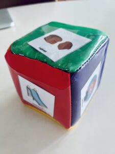 Jeg elsker de her terninger, da de kan bruges på mange forskellige måder. En oplagt måde er at klippe øvekortene ud og placere de forskellige øveord i lommerne. Rul eller kast med terningen og benævn det ord som terningen lander på. Lav nogle forskellige regler – man kan fx tilføje et antal af gange man skal sige et konkret ord. Man kan også kaste med en anden terning ved siden af som bestemmer antallet af gentagelser – det er kun fantasien der sætter grænser!