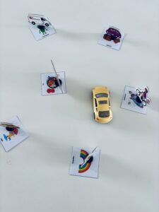 Lav forskellige stops hvor de forskellige øveord placeres. Dette kan være på bordet (ligesom der ses på billedet) eller rundt omkring i stuen eller huset. Barnet skal nu med en bil eller andet køretøj kører rundt mellem de forskellige stops. Når barnet kommer til et stop, skal øveordet benævnes. Gentag 3-5 gange så udtalen trænes ekstra – eller lad barnet køre forbi billederne flere gange, så barnet på den måde kan få gentaget øveordene flere gange.