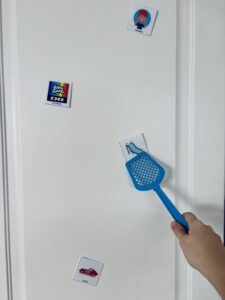 Placér øveordene rundt omkring i huset, på væggen, gulvet eller lign. Når barnet finder et ord skal barnet benævne ordet og herefter give det et ordentligt klask med fluesmækkeren. En simpel men sjov måde at øve på – og en god måde at få inddraget noget aktiv bevægelse, hvis man har et barn der har svært ved at sidde stille.